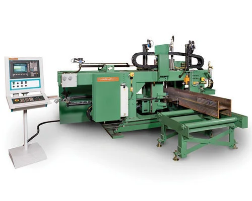 The PCD-1100/3B Beam Drill Line is a machine designed to apply high speed steel (morse taper) drill tooling to the production of structural steel members. From square/rectangular tubing to angle iron, the PCD-1100/3B will quickly and accurately produce 50-75 tons per week of processed profiles (this can fluctuate based on section size and complexity of operations).