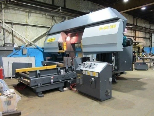The H-40/60 has a workload capacity of 50,000 lbs. A 5 HP driven hydraulic pump supplies system pressure through 3-position directional valves controlling all vising, head up/down, blade tension, guide arm, and shuttle movement.