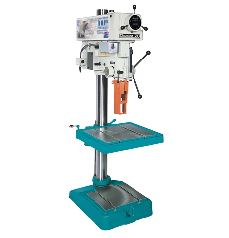 Clausing 20” Floor Drill Press, 300-2000 RPM Vari-Speed with counter shaft and sheave pulley drive, 2.5” diameter quill, 3MT taper spindle, 22” x 19.5” adjustable work table, 1 ½ hp spindle motor, 110/220 volt 1 Phase voltage