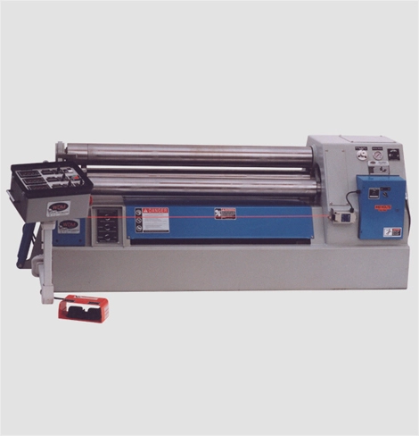 The 403 Series 4-roll double pinch plate bending machine is in a sense a 3-roll initial pinch plate bending machine with an extra bending roll on the front side of the pinch rolls. The advantage of this type of machine is that it enables the operator to roll the workpiece from the leading to the trailing edge with minimal and usually negligible flats. As a rule of thumb, the flats are less than 1 1/2 to 2 times the work piece thickness. This can be accomplished in a single pass without turning the workpiece.