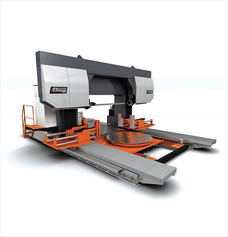 The Gantry features a fixed table and moving head designed for cutting very large, heavy material. This machine allows for vertical, horizontal, and angle cuts without having to move the material; ideal for ingots and forgings as well as large blocks of steel. Typical application would be to cut plate horizontally from large blocks, to rough out holds to vastly reduce machining time, and more recently rough out frack blocks prior to machining.
