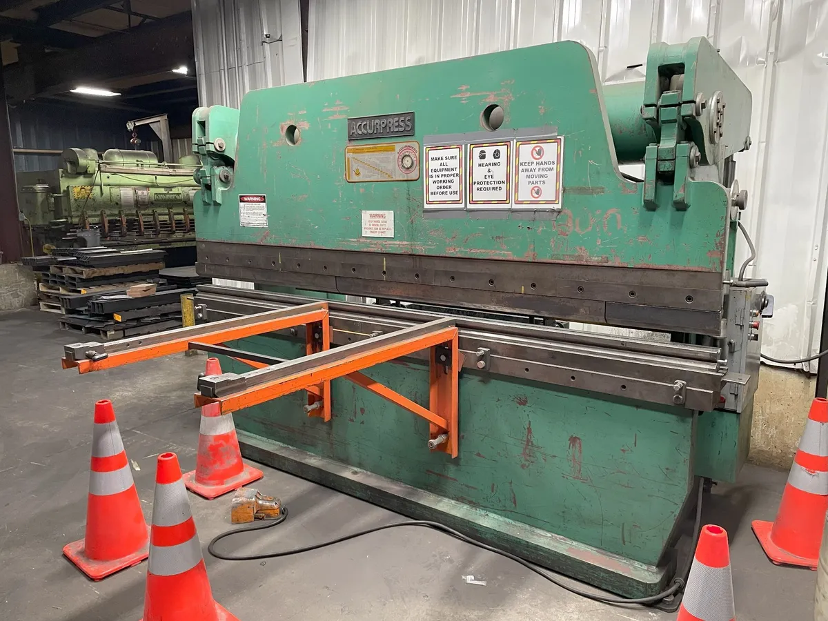 ACCURPRESS press brake, 1985, in very good condition and currently in operation. Ideal for precision metal bending tasks. A robust addition to your workshop's machinery lineup. Contact for detailed specifications and viewing arrangements.