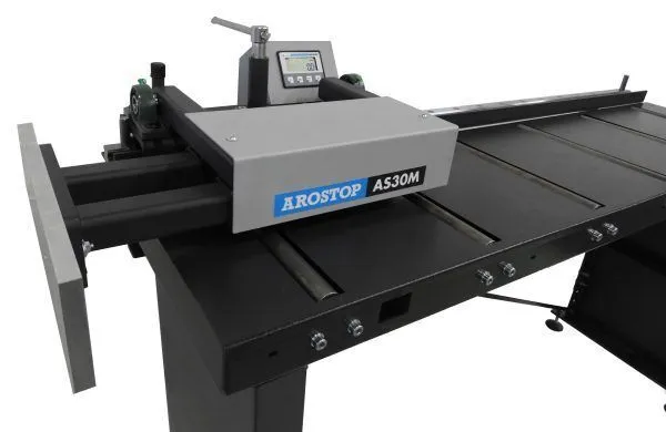 For manual operation, the AROSTOP AS30M offers a digital measuring system suitable for machines with a clamping capacity up to 15.75 inches and light to medium-heavy materials. Similar to the AS 30A, it consists of a large steel angle line with a 1.18-inch linear guide, a servo-controlled stop carriage with 2 play-free linear carriages. Mounted on the discharge side, this model functions as a stop measuring system with a simple and clearly readable digital display. It can be easily mounted on various roller conveyors.